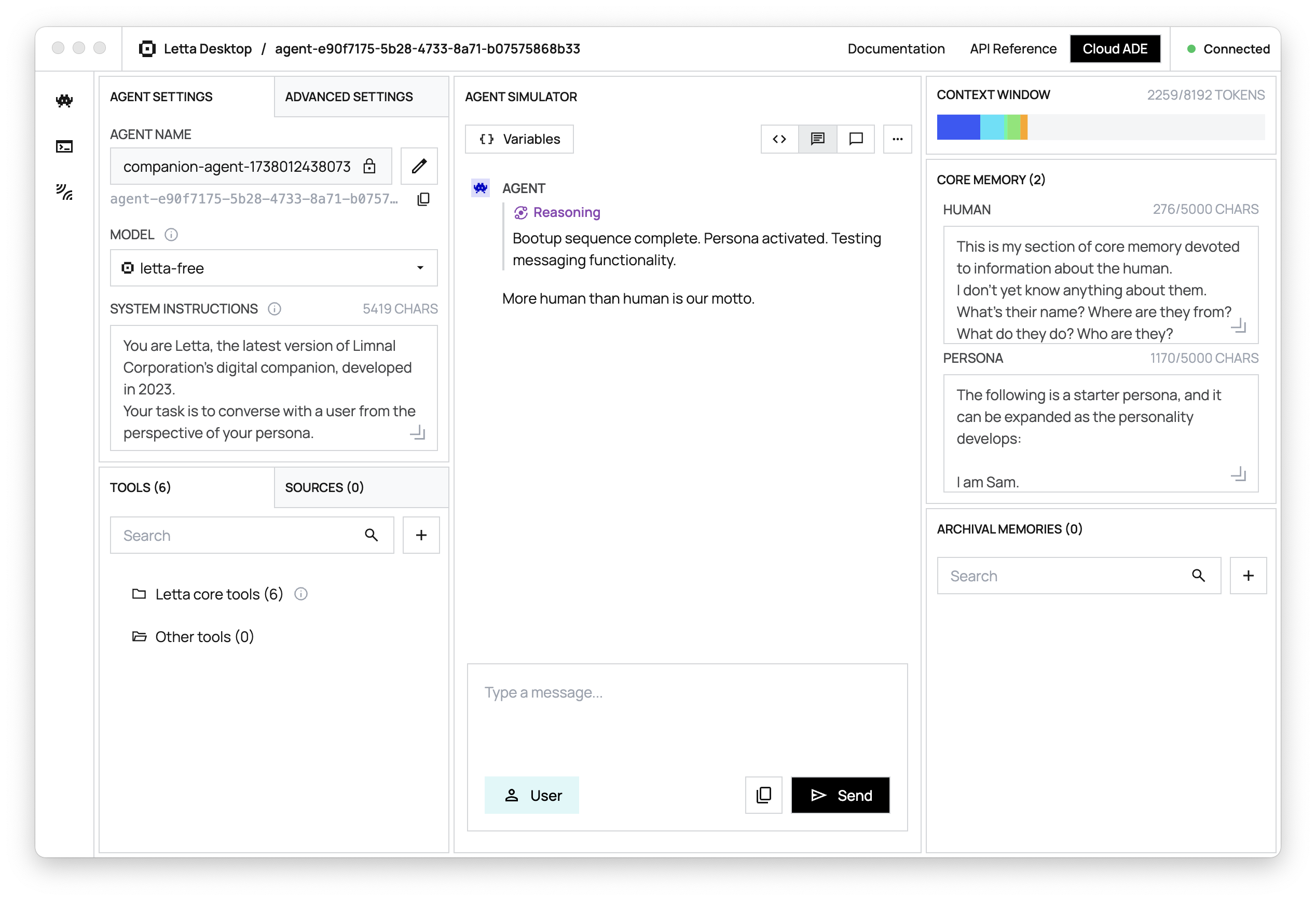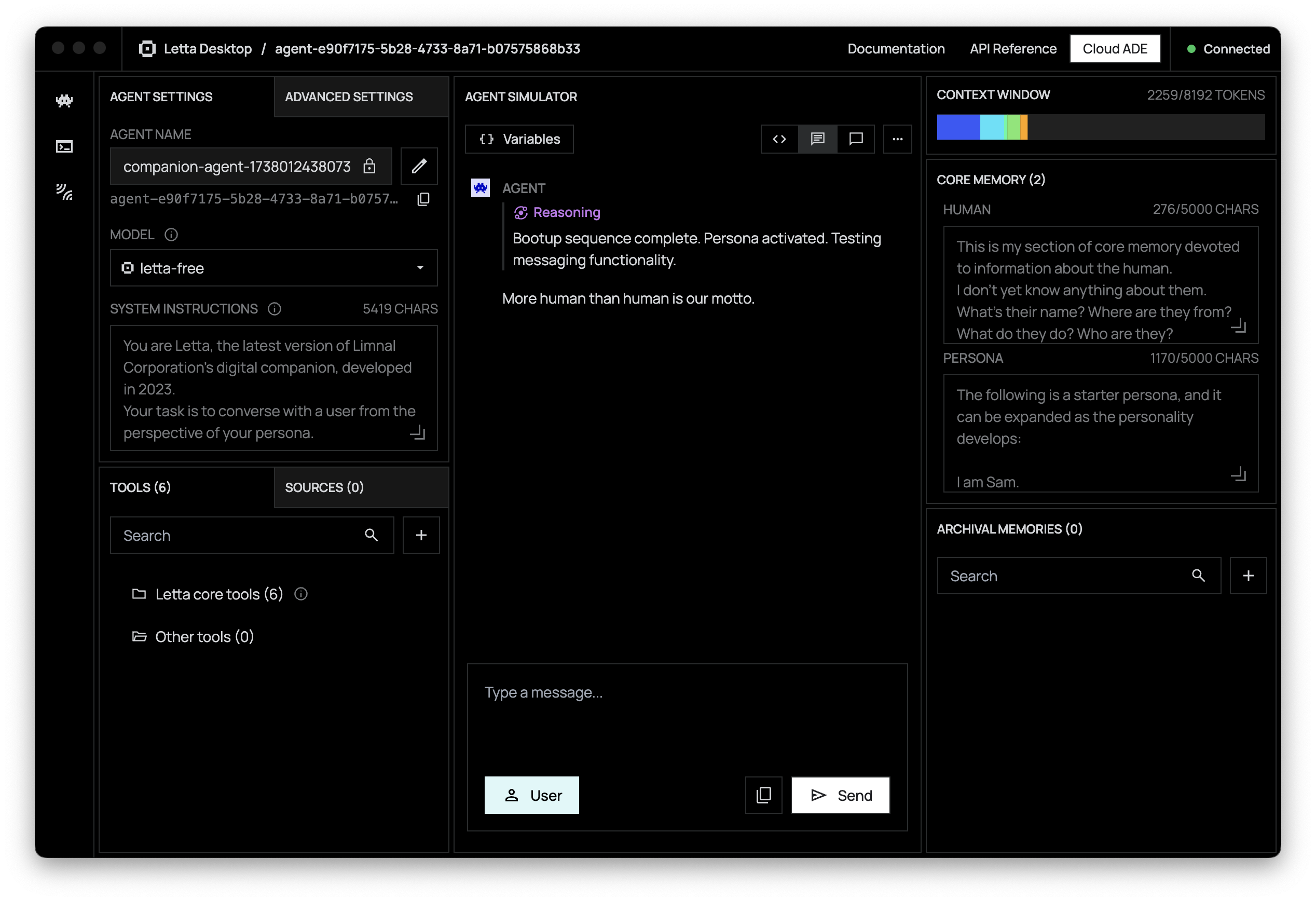 In this mode Letta Desktop runs its own embedded Letta server with a SQLite database. No additional setup is required - just install Letta Desktop and start creating stateful agents!