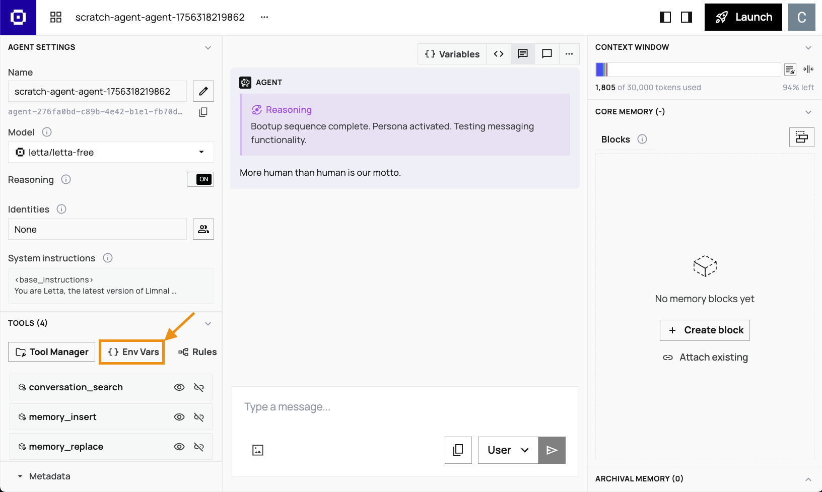 Section titled “Assigning tool variables in the ADE”To assign tool variables in the Agent Development Environment (ADE), click on Env Vars to open the Environment Variables viewer: