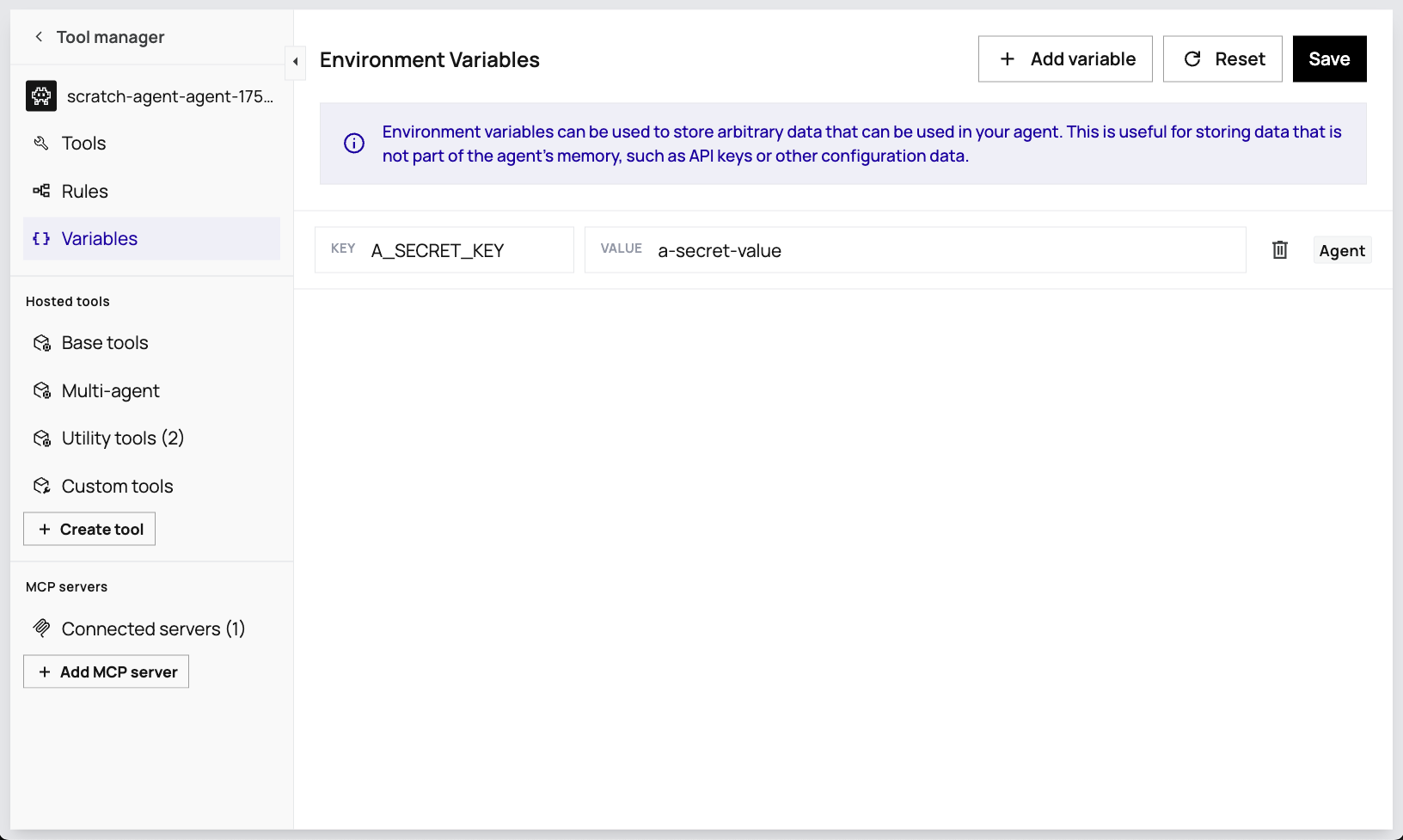 Section titled “Assigning tool variables in the API / SDK”You can also assign tool variables on agent creation in the API with the tool_exec_environment_variables parameter: