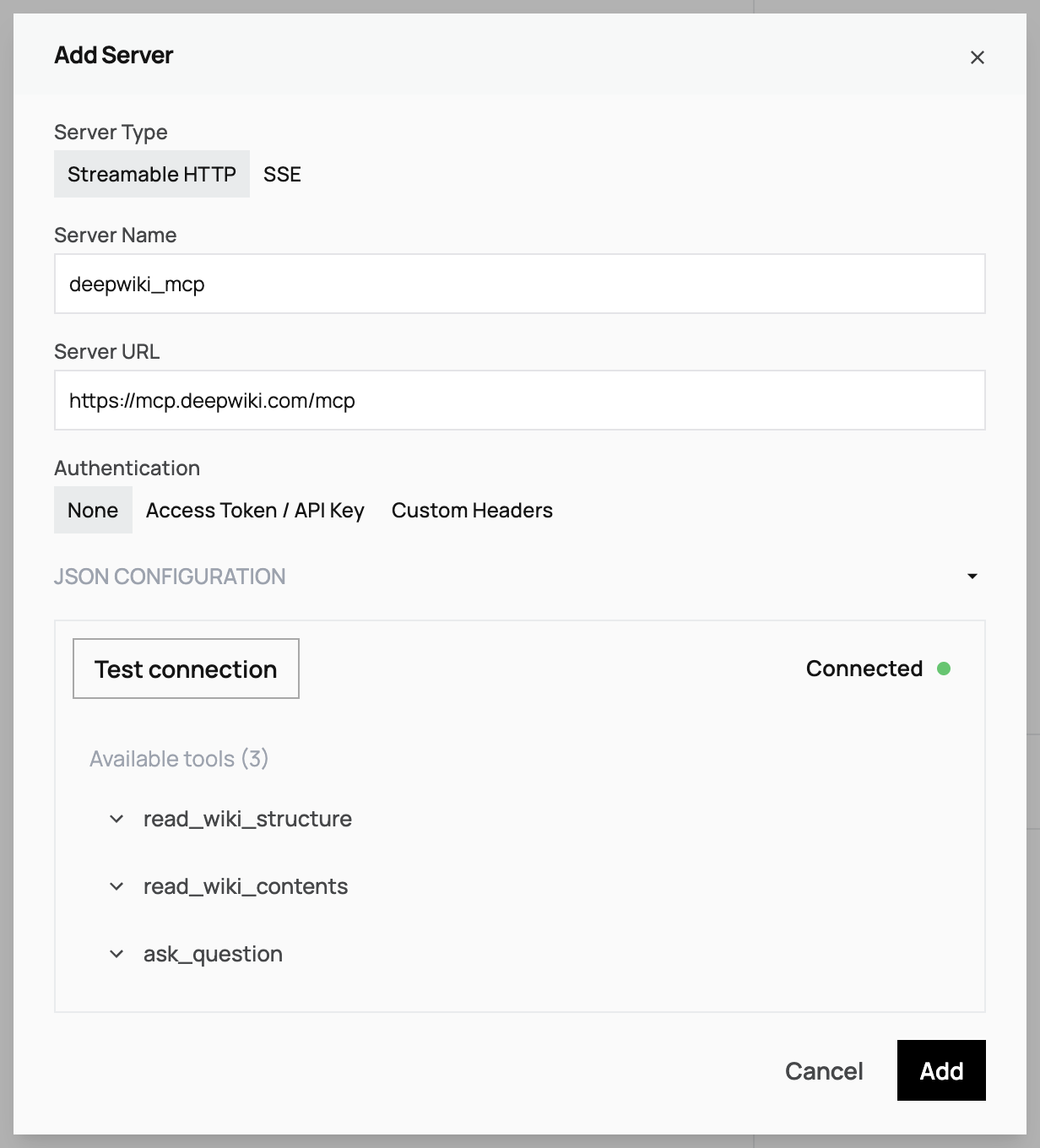 client.tools.add_mcp_server(request=agent_scoped_config)SSE (Deprecated)
