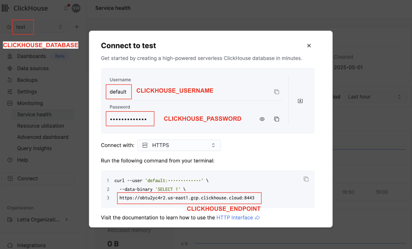docker run \ -v ~/.letta/.persist/pgdata:/var/lib/postgresql/data \ -p 8283:8283 \ ... -e CLICKHOUSE_ENDPOINT=${CLICKHOUSE_ENDPOINT} \ -e CLICKHOUSE_DATABASE=${CLICKHOUSE_DATABASE} \ -e CLICKHOUSE_USERNAME=${CLICKHOUSE_USERNAME} \ -e CLICKHOUSE_PASSWORD=${CLICKHOUSE_PASSWORD} \ -e LETTA_OTEL_EXPORTER_OTLP_ENDPOINT=http://localhost:4317 \ letta/letta:latestFinding your credentials in ClickHouse Cloud