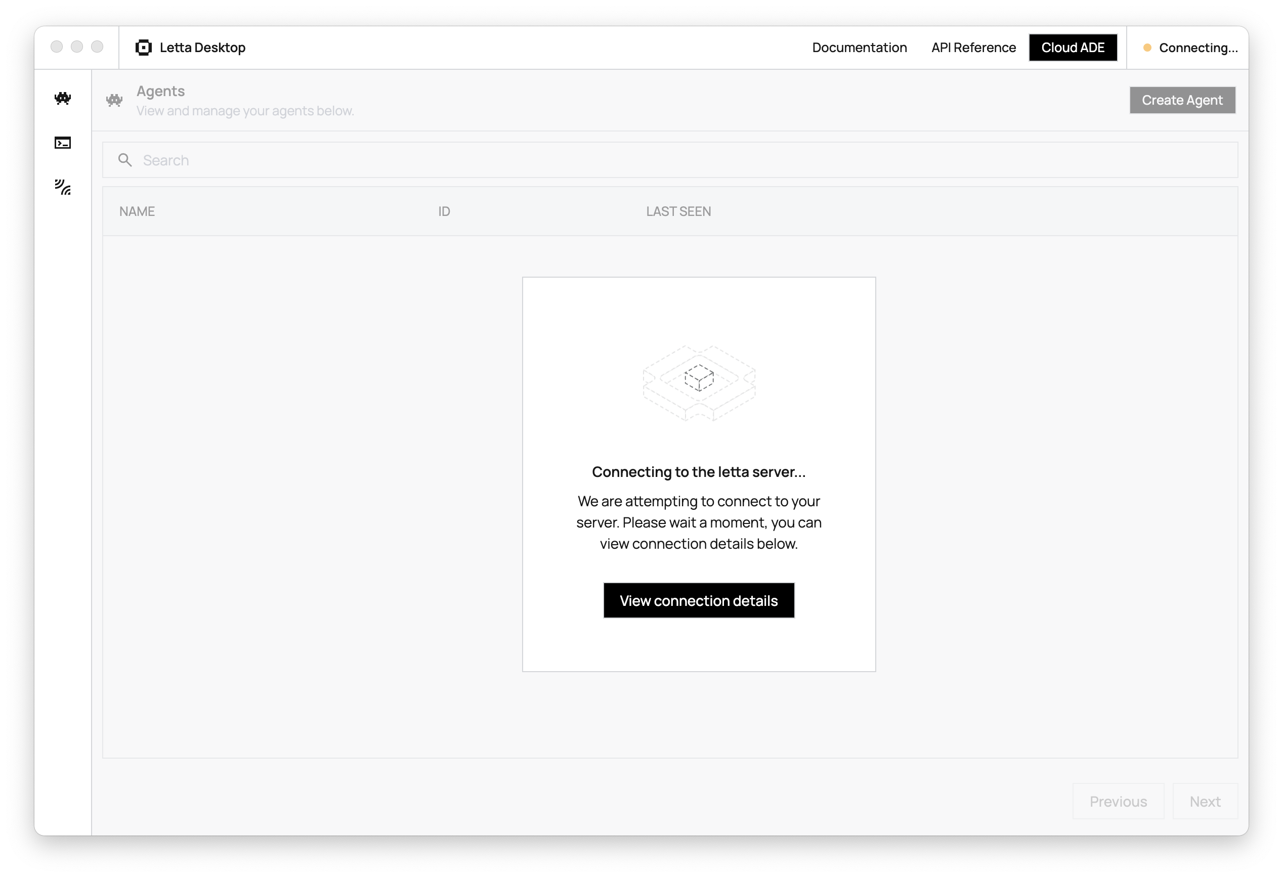 When you launch Letta Desktop, you’ll be prompted to wait while the Letta server starts up. You can monitor the server startup process by opening the server logs (clicking the icon).